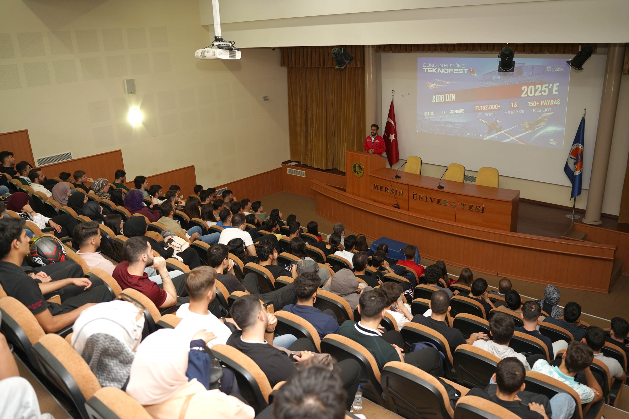 T3 Vakfı Mersin İl Sorumlusu ve TEKNOFEST Ulaşım Koordinatörü Ahmet Bozdoğan tarafından gerçekleştirilen sunumda, T3 Vakfı’nın çalışmaları, TEKNOFEST’ in hedefleri ve gençlerin Milli Teknoloji Hamlesindeki rolü üzerine detaylı bilgiler paylaşıldı.