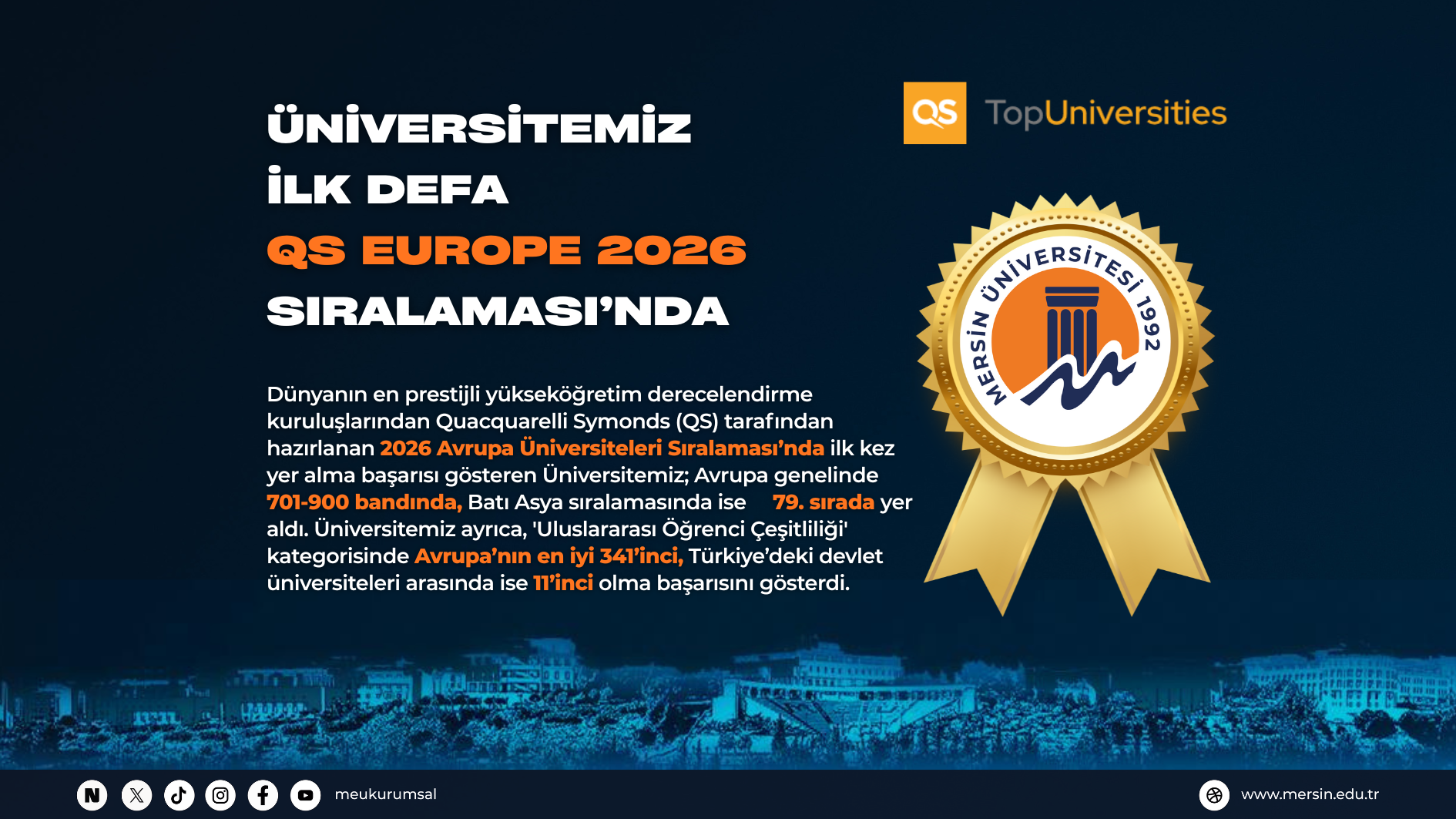 Üniversitemiz, yükseköğretim dünyasının en prestijli derecelendirme kuruluşlarından Quacquarelli Symonds (QS) tarafından hazırlanan “2026 Avrupa Üniversiteleri Sıralaması”na (QS Europe Rankings 2026) girerek uluslara